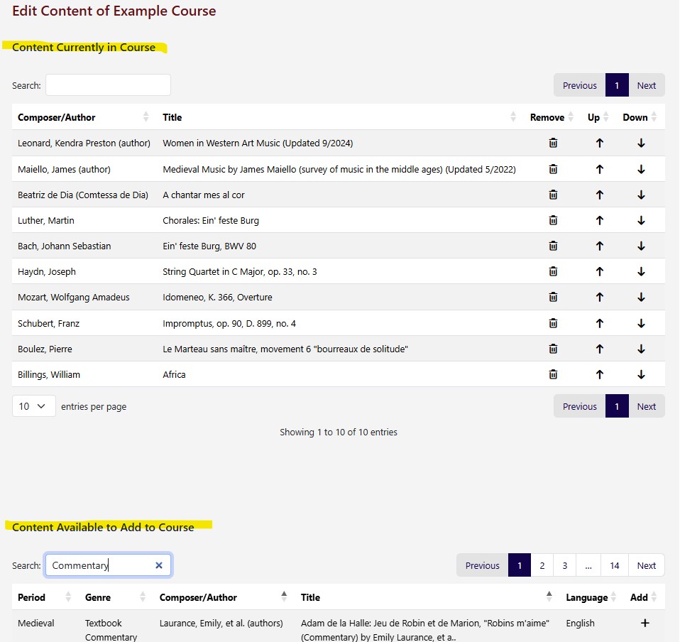 To preview your courses, click “My Courses” for a list that will include all the default music history and music theory courses, along with the custom courses you made. Click on the name of the course you want to preview to see its content and the order in which they appear.