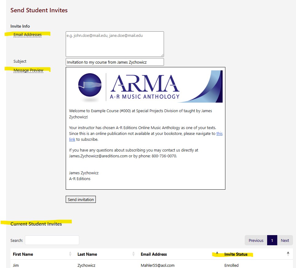 After your course if ready, you can invite your students to it directly from ARMA. Use the Invite Students page to