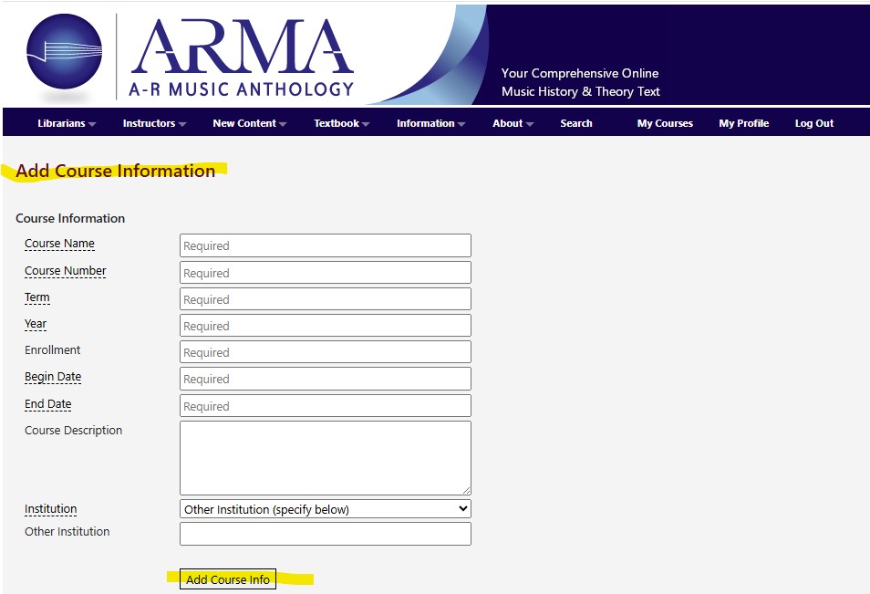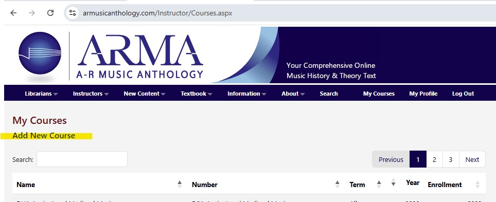 Your instructor login opens to your course page, where you can make your courses. Start by clicking “Add New Course” and follow the prompts. As you proceed, keep in mind that you always have the ability to revise the content. If the course title changes or its descriptions needs an update, you can always revise the information in ARMA.