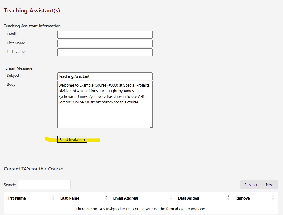 You can add TA the same way as you invited students. Please click “Manage TAs” for the page that lets you prepare your message, enter TAs’ email addresses, and send the invitation to the TAs. TAs receive complimentary access to your courses as soon as you invite them. Unlike print, they do not have to wait for the copy to arrive, since ARMA’s digital environment gives immediate reesults. Please know, too, that TAs lack the functionality to change your courses. Only you can change the items and their organization in your courses.